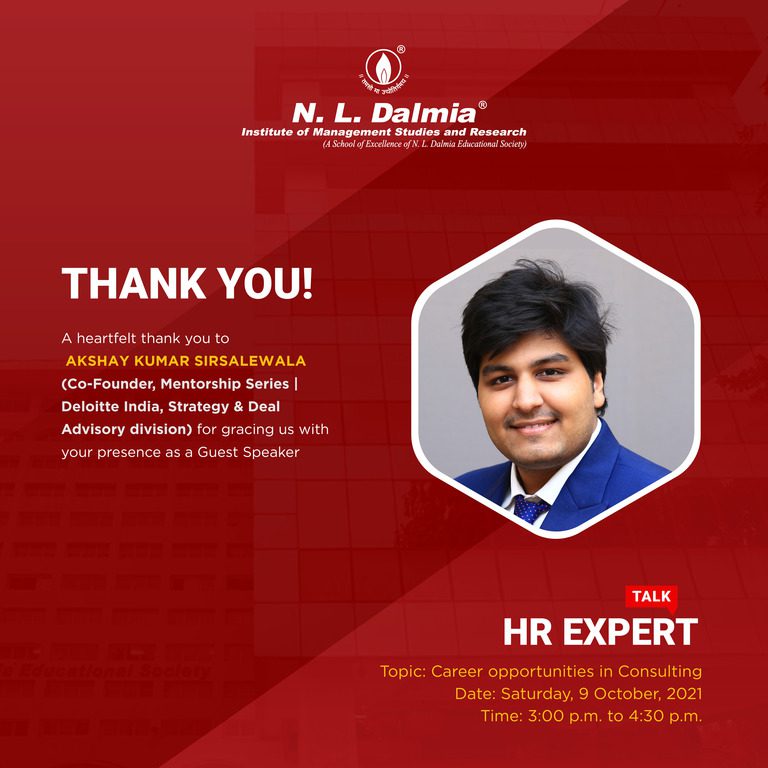 HR Expert Talk Team would like to thank Mr. Akshay Kumar Sirsalewala (Co-Founder, Mentorship Series| Deloitte India, Strategy & Deal Advisory division) for conducting an interactive session for all students on Career opportunities in Consulting.