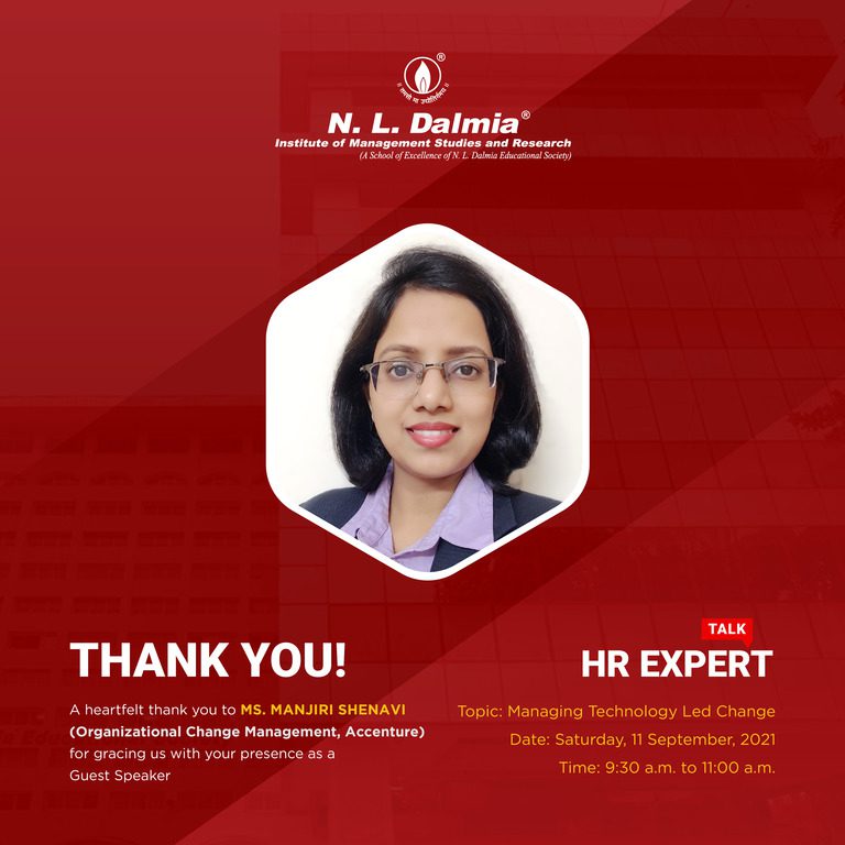 The HR Expert Talk Team organized a guest session on “Managing Technology Led Change” for HR second year students. We were pleased to host our own Alumni Ms. Manjiri Shenavi,Organizational Change Management, Accenture.We feel grateful to have her on our platform.