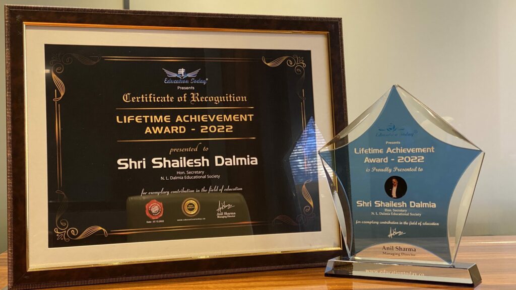 Awarded By : Lifetime Achievement Award to Shri Shailesh Dalmia Shri Shailesh Dalmia, Hon. Secretary of N. L. Dalmia Educational Society, received the Lifetime Achievement Award and Certificate for his exemplary contribution to the field of education by Education Today.